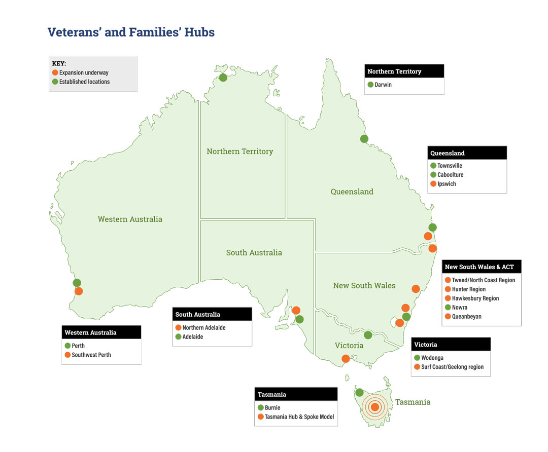 Veterans’ and Families’ Hubs provide a central access point to local veteran and family services, such as wellbeing support, physical and mental health services, advocacy, employment and housing advice, and social connection. Hubs either directly provide or facilitate access to these services in partnership with ex-service organisations, community and other organisations, and state and territory governments.