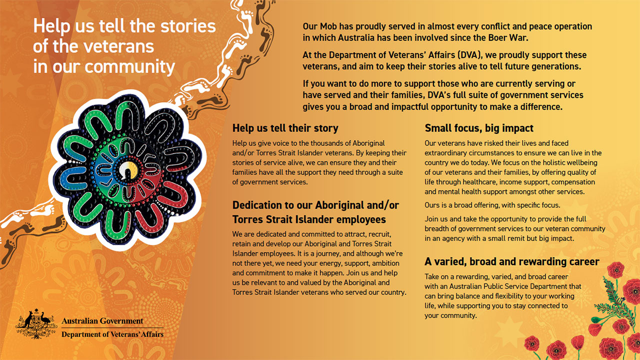 We have exciting career opportunities for Aboriginal and Torres Strait Islander peoples. The Department of Veterans’ Affairs operates in various locations and offers flexible workplace arrangements, enabling opportunities to balance the work you do and how you can do it.