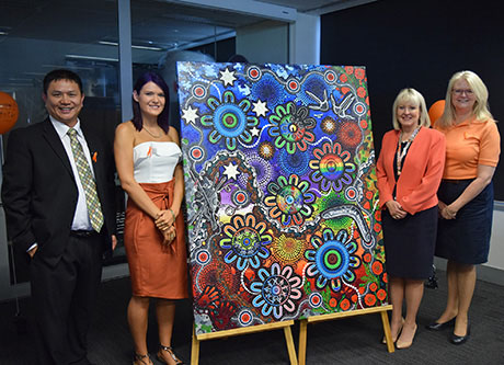 Artist — Chern'ee Sutton, a young contemporary Indigenous artist from the Kalkadoon people, Mount Isa area in Queensland; with former Secretary Liz Cosson, former CALD Champion Edel Kairouz and CultureVerse Director, Loc Trinh.