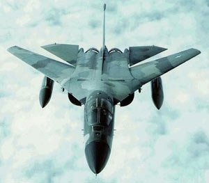 Front view of an F-111 jet fighter flying over clouds.