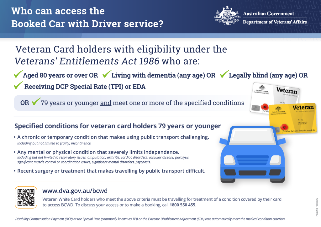 Veteran Gold and White Card holders with eligibility under the Veterans' Entitlements Act 1986 (VEA) may have access to the BCWD service, where DVA arranges taxi or hire car transport on your behalf with no out of pocket expenses.