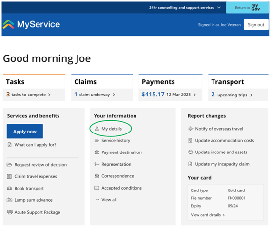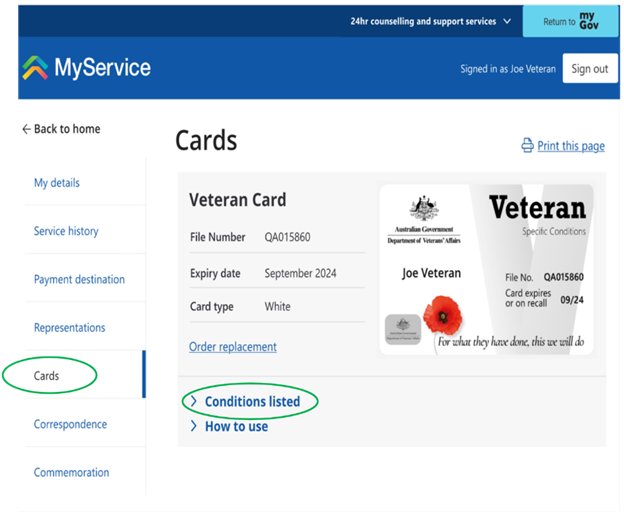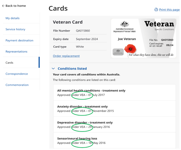 If you are unable to access MyService or are uncomfortable with the system, you can request a “Confirmation of Accepted Conditions” letter from our Veterans Access Network (VAN) team. Their best contact number is 1800 (VETERAN) 1800 838 372 or you can email this request to generalenquiries@dva.gov.au.