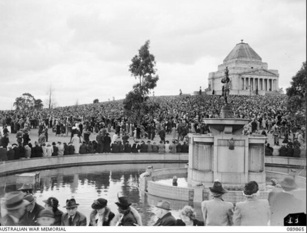 100,000 people attended the VE Day service at the Shrine of Remembrance in Melbourne on 9 May 1945. Image courtesy of the Australian War Memorial, 089865.