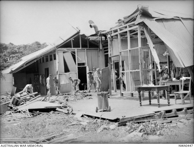 Australian servicemen in Darwin repairing a bombed building after the second air raid by Japanese warplanes on 19 February 1942. These were possibly huts at the RAAF base.