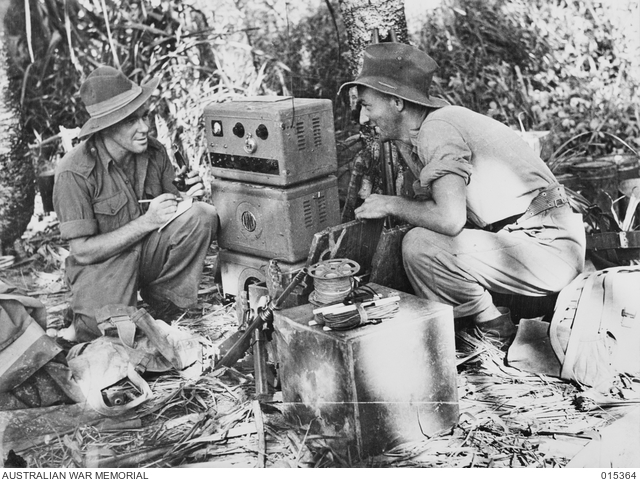 Below: Sergeant Frank J Parmiter of Coburg, Vic, and Corporal Ivan G Pritchard, of Kensington, NSW – spotters with the New Guinea Air Warning Wireless Company – at work beside their AWA radio at an observation post.
