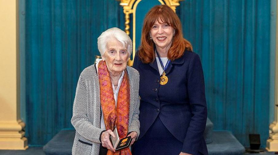 Victorian Governor Professor Margaret Gardner AC (right) presents Margaret Ekberg, the daughter of Pilot Officer David Taylor, with his Medal for Gallantry for heroism in PNG during the Second World War.