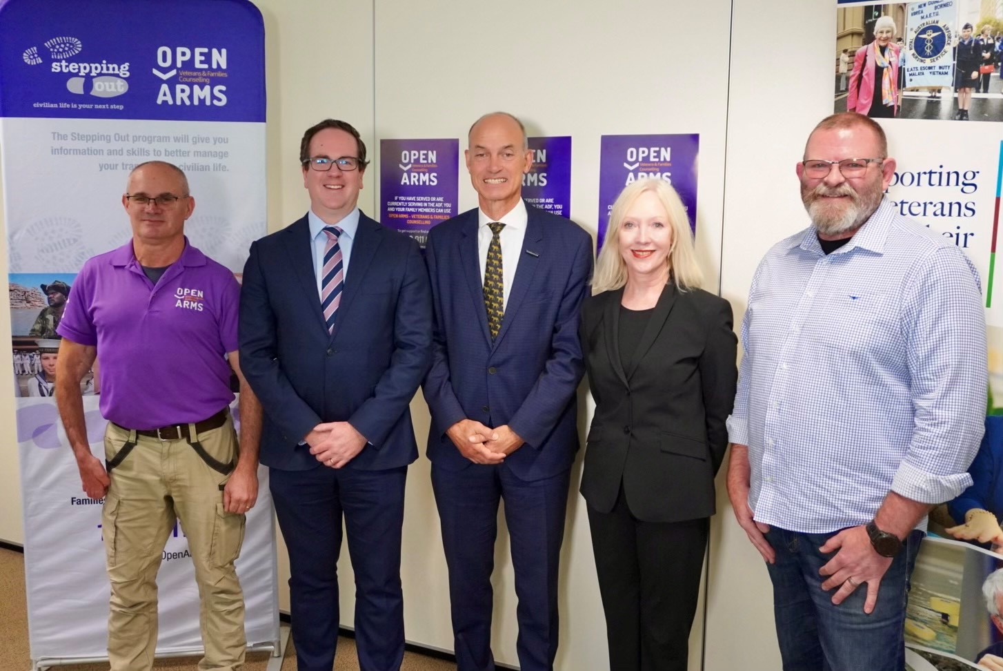 Image L to R: Lived Experience Peer Shane Morgan, Minister Matt Keogh, Tasmanian Minister for Veterans’ Affairs Guy Barnett, Open Arms National Manager Leonie Nowland and DVA Chief Psychiatrist Dr Jon Lane