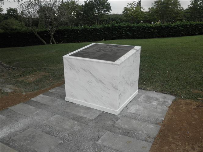 The memorial stands to the left of the steps leading up to the entrance of the Kranji War Cemetery, 22 kilometres from the city of Singapore, on the north side of Singapore Island overlooking the Straits of Johore.
