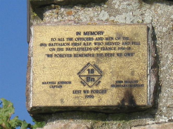 The other inscription reads " In memory to all the officers and men of the 18th Battalion First AIF who served and fell on the battlefields of France 1914 - 1918. We forever remember the debt we owe".