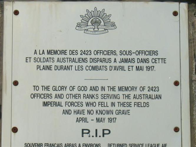 The memorial is dedicated to the 2,423 Officers and other ranks serving the Australian Imperial Force who fell in the fields at Bullecourt in France during the First World War.