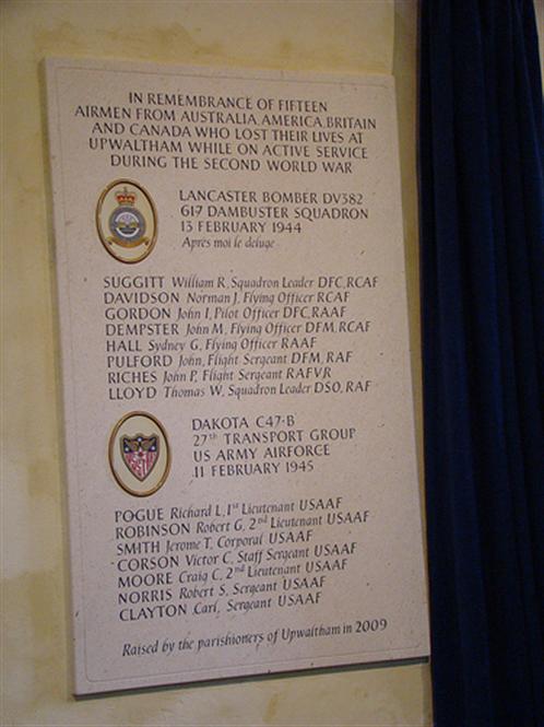 The Memorial Plaque, which is made of white Italian Aura stone and worked by Richard Klose, Master Stone Mason, has the 617 Squadron insignia (motto: Apres Moi le Deluge) and the chevron of The 27th Transport Group, USAC painted and fired in enamel on steel and set into the stone by enamellist Gillie Hoyte Byrom.