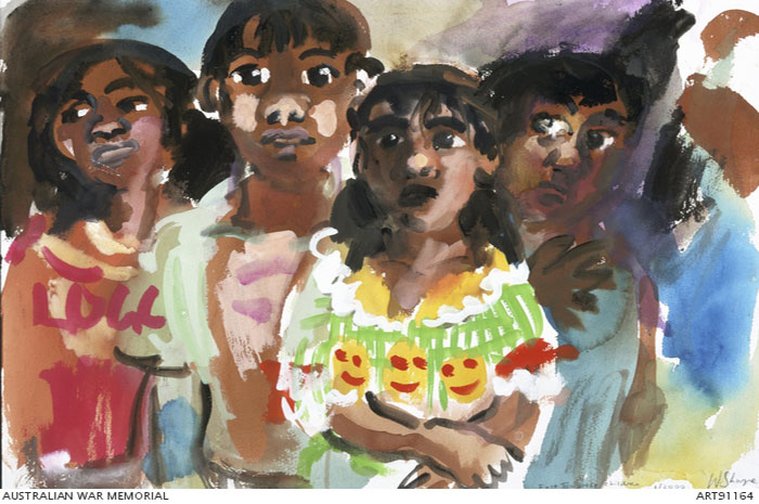 Of her time in Timor-Leste Wendy said, 'There would be so many children around me I would end up painting them... They are so friendly and so warm. When you arrive in Suai you are smiled at and waved at... It's unbelievable that all those terrible things have happened to them. I have heard so many horrific stories ... Children were saying things like "G'day, mate" and "G'day cobber" in perfect accents.' Wendy Sharpe, ‘Sydney Morning Herald’ 31 December 1999.